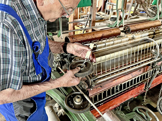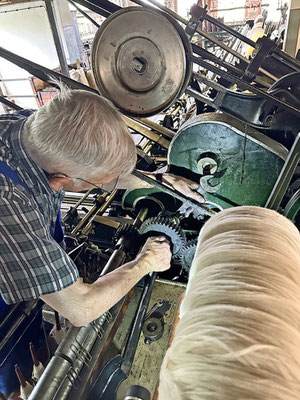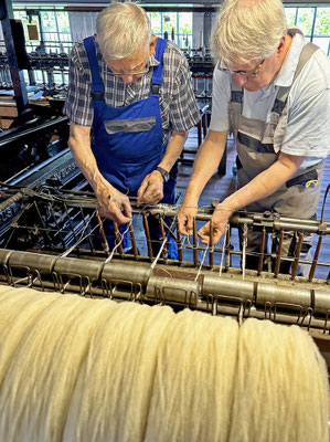 Am Dienstag, den 24. Juni war es mal wieder so weit: Eberhard Bley, Textilingenieur aus Lengenfeld/Sachsen kam zum Arbeitsbesuch am großen Wagenspinner, dem Selfaktor, in die Wollspinnerei Blunck.